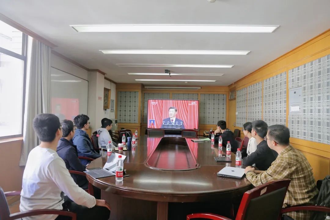 南门附近19-21楼的楼道中,总书记做报告的声音从各个讨论室中传出,这里是学院博士生和博士后的工作地点。他们一早来到楼内,或相约观看,或自行收看。