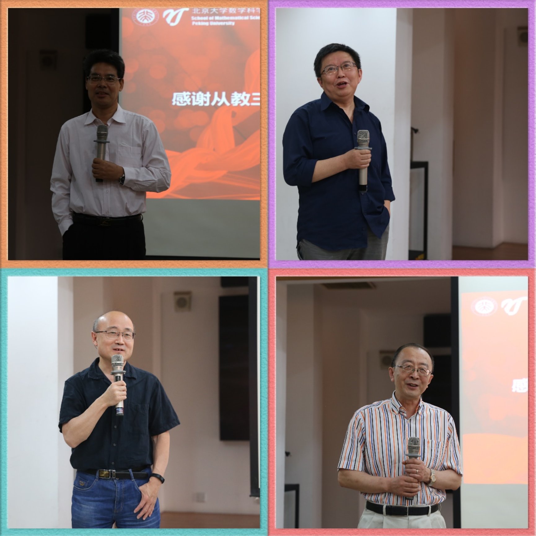 从教三十年的教师分别发表了个人感想和期望。柳彬老师提及看了学生的祝福视频,看到视频里自己年轻的模样,感慨起时光飞逝,表达了未来至少5年内继续奋斗在教学第一线的决心。李东风老师提及未意识到自己就已经工作了30年,非常感谢北京大学这个平台,是北大培养了他并给予了他非常多的机会,他深切地表达了对北京大学、领导、前辈老师的感谢之情。他谈及教学感悟,希望年轻的教师们能够多吸收国际上的教学经验,取长补短,以便更好地激发学生的好奇心以及学习劲头,为教学做出更多的成绩,培养更多一流的人才,为北大的双一流建设做贡献。田青春老师回忆起这三十年的峥嵘岁月——三十功名尘与土,八千里路云和月,表达了对丁先生的知遇之恩,让他能够在北大的舞台上拥有丰富的经历,他讲述了他给后辈写“爱自己,爱家人,爱单位,爱工作,爱集体”的心路历程,眉眼间流露出对后辈满满的希翼。王冠香老师回忆起弹指一挥间的岁月,表达了对学院的感谢之情和在北大的无悔岁月。