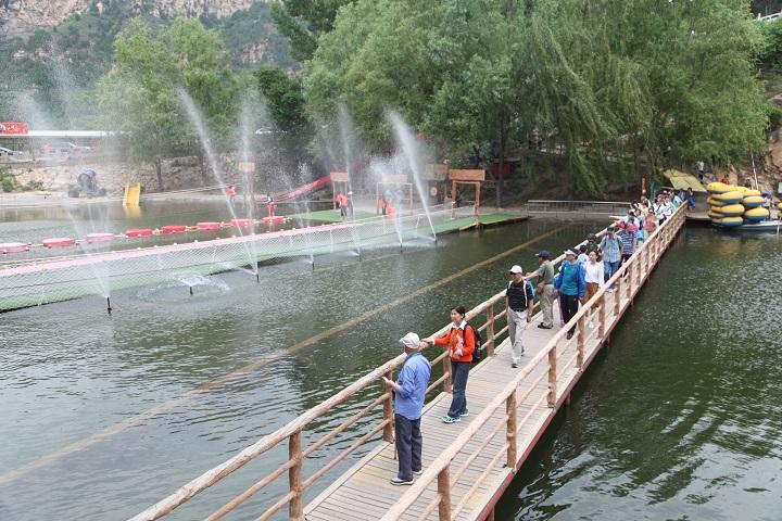 近3个小时的车程丝毫没有影响大家的兴致,许多老师之间都是久未逢面,彼此交流甚欢。密布的云层遮掩了初夏的骄阳,为老师们的攀登提供了良好的环境。步入大门拾级而下,走上穿湖而过的小桥,一阵阵击鼓声吸引了大家的注意。右侧水上钢丝、软桥、浮萍等水上拓展项目伴随着不时喷涌的喷泉和游人的嬉闹声,使大家一扫旅途的疲惫,兴致高昂。而顺风而来的水雾,更是让大家感受到了密云特有的清凉。
