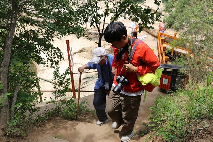 湖的另一侧不多远,迎面而来的是顺着山涧石缝奔泻而下的一川瀑布,蜿蜒高耸的木质台阶在一侧静候大家的征服。很多台阶高差较大,对年事已高的离退休老师们是不小考验。不少中青年老师们主动挑起了照顾长者的担子,大家彼此扶持协助,沉稳有序地向上攀登。随行的小朋友们也很快打成一片,为大部队带来了欢笑与活力。一路途径迎仙瀑和喜仙瀑,老师们在三潭叠泻处的小亭稍作歇息后,又一鼓作气攀至坝上的清凉湖。湖中竹筏条条,大伙欢声阵阵。