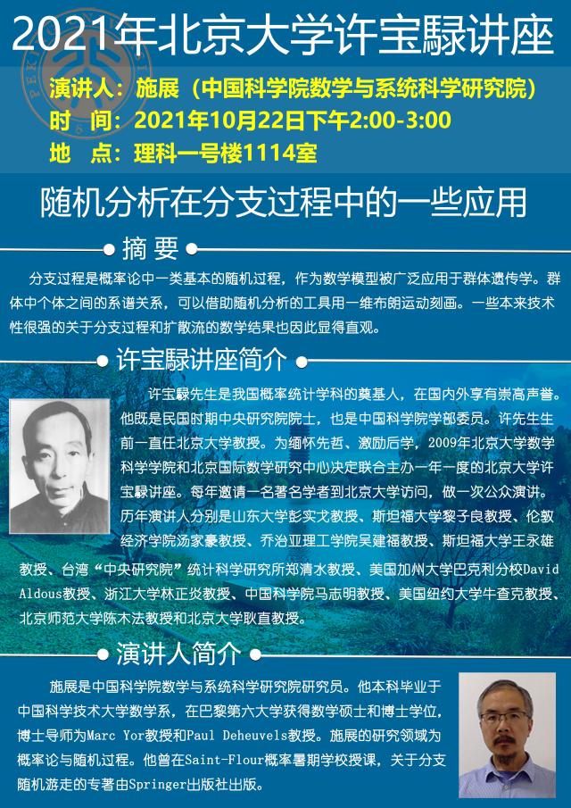 许宝騄讲座简介:许宝騄先生是我国概率统计学科的奠基人,在国内外享有崇高声誉。他既是民国时期中央研究院院士,也是中国科学院学部委员。许先生生前一直任北京大学教授。为缅怀先哲、激励后学,2009年北京大学数学科学学院和北京国际数学研究中心决定联合主办一年一度的北京大学许宝騄讲座。每年邀请一名著名学者到北京大学访问,做一次公众演讲。历年演讲人分别是山东大学彭实戈教授、斯坦福大学黎子良教授、伦敦经济学院汤家豪教授、乔治亚理工学院吴建福教授、斯坦福大学王永雄教授、台湾“中央研究院”统计科学研究所郑清水教授、美国加州大学巴克利分校David Aldous教授、浙江大学林正炎教授、中国科学院马志明教授、美国纽约大学牛查克教授、北京师范大学陈木法教授和北京大学耿直教授。