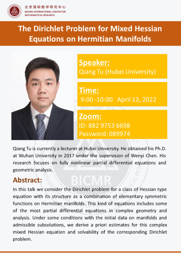Qiang Tu is currently a lecturer at Hubei University. He obtained his Ph.D. at Wuhan University in 2017 under the supervision of Wenyi Chen. His research focuses on fully nonlinear partial differential equations and geometric analysis.