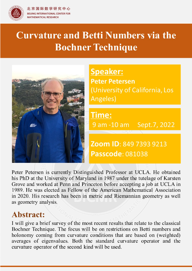 Peter Petersen is currently Distinguished Professor at UCLA. He obtained his PhD at the University of Maryland in 1987 under the tutelage of Karsten Grove and worked at Penn and Princeton before accepting a job at UCLA in 1989. He was elected as Fellow of the American Mathematical Association in 2020. His research has been in metric and Riemannian geometry as well as geometry analysis.