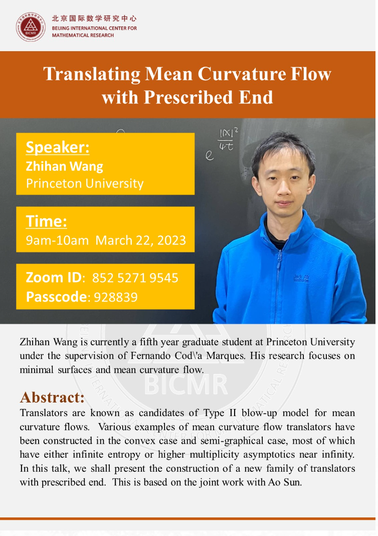 Speaker: Zhihan Wang is currently a fifth year graduate student at Princeton University under the supervision of Fernando Cod\'a Marques. His research focuses on minimal surfaces and mean curvature flow.