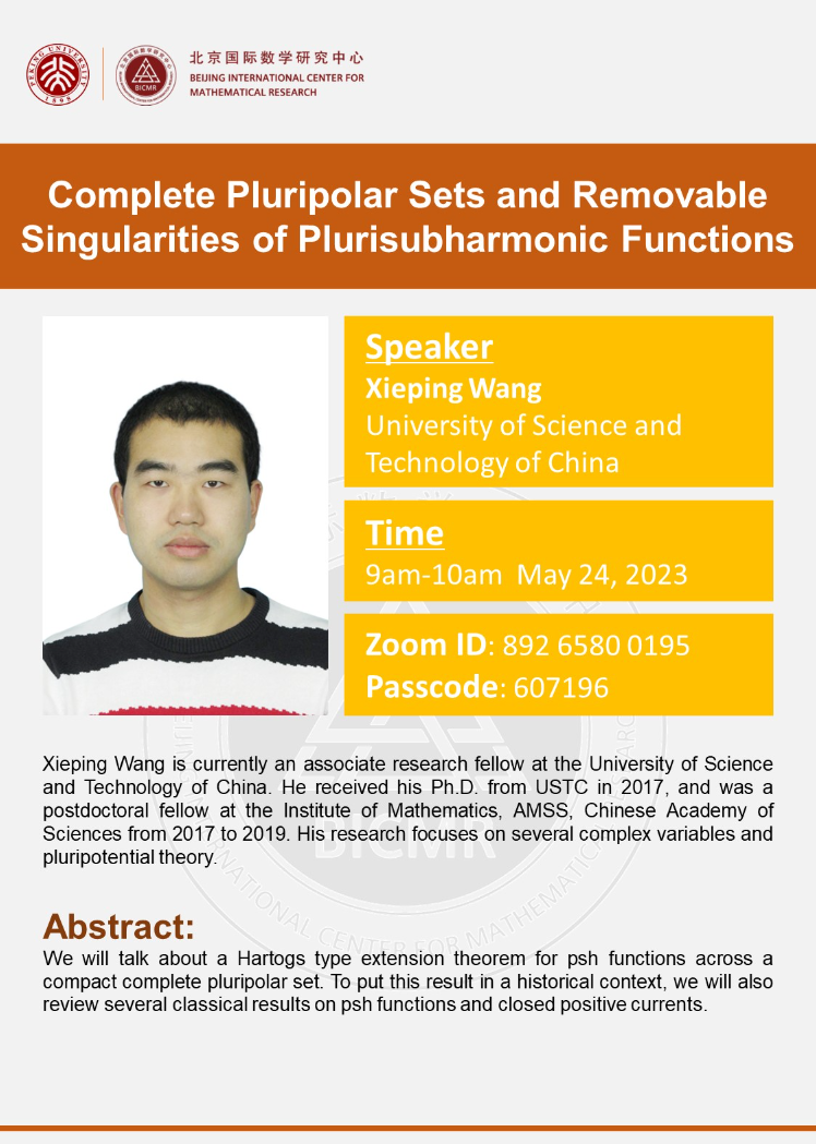 Speaker: Xieping Wang is currently an associate research fellow at the University of Science and Technology of China. He received his Ph.D. from USTC in 2017, and was a postdoctoral fellow at the Institute of Mathematics, AMSS, Chinese Academy of Sciences from 2017 to 2019. His research focuses on several complex variables and pluripotential theory.