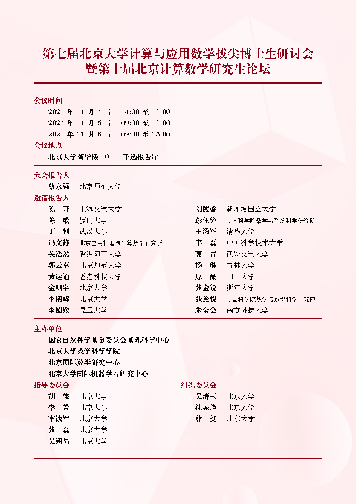 为了促进计算与应用数学领域优秀博士生之间的互学互鉴,为大家提供展示成果、相互学习、了解前沿和自由讨论的平台,第七届北京大学计算与应用数学拔尖博士生研讨会暨第十届北京计算数学研究生论坛计划于2024年11月4日-2024年11月6日在北京大学召开,目的是希望与会者通过该项活动,提高表达能力、拓宽研究视野、增强创新意识,进一步激发科研热情,树立攻坚克难的决心和信心,共同提高,一起进步。
