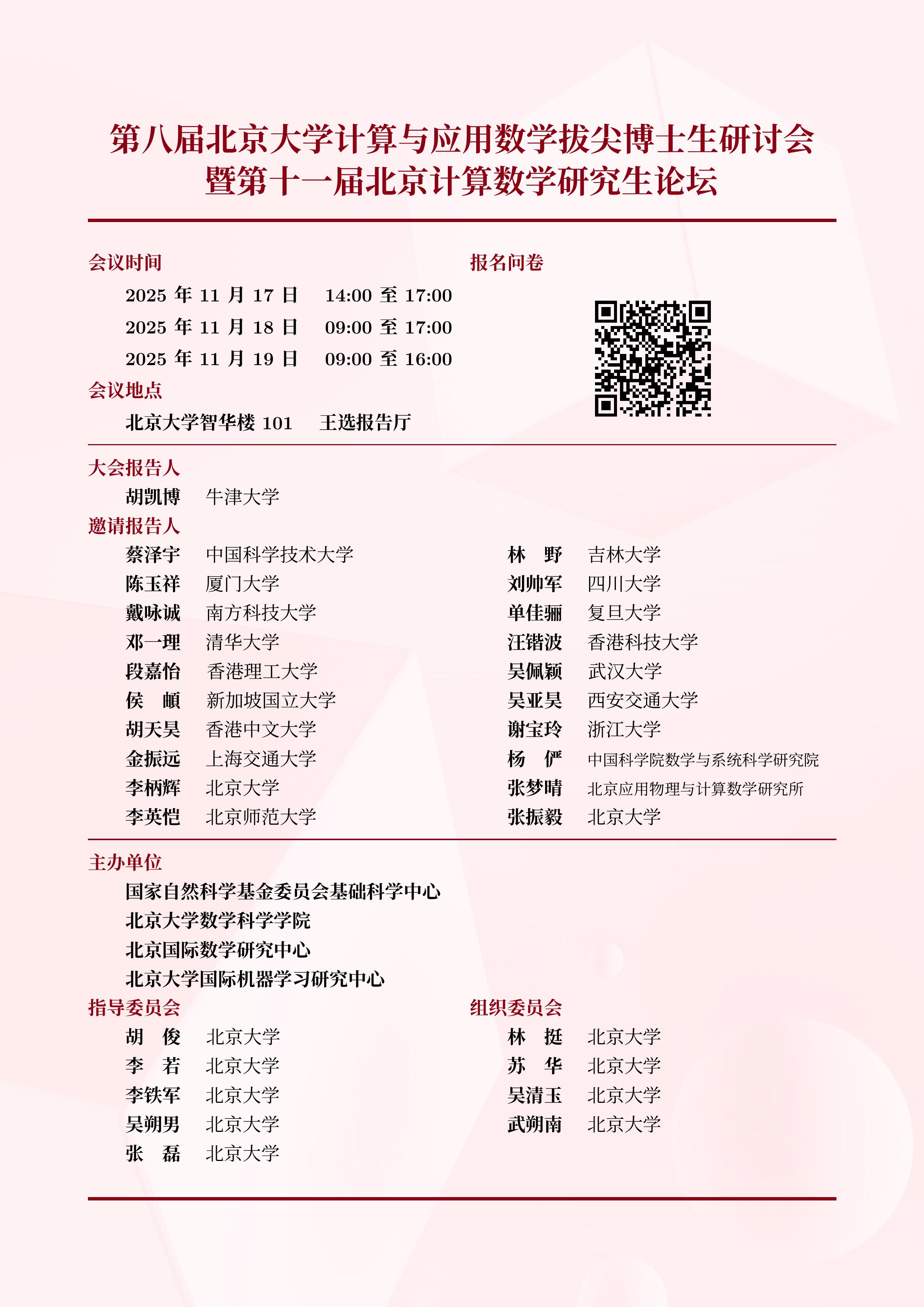 为促进计算与应用数学领域优秀博士生之间的互学互鉴,搭建展示成果、交流学习、了解前沿、自由讨论的学术平台,第八届北京大学计算与应用数学拔尖博士生研讨会暨第十一届北京计算数学研究生论坛将于2025年11月17日-11月19日在北京大学举行。期待与会者通过此次研讨,提升学术表达能力,拓宽研究视野,增强创新意识,激发科研热情,坚定攻坚克难的决心与信心,实现共同进步。