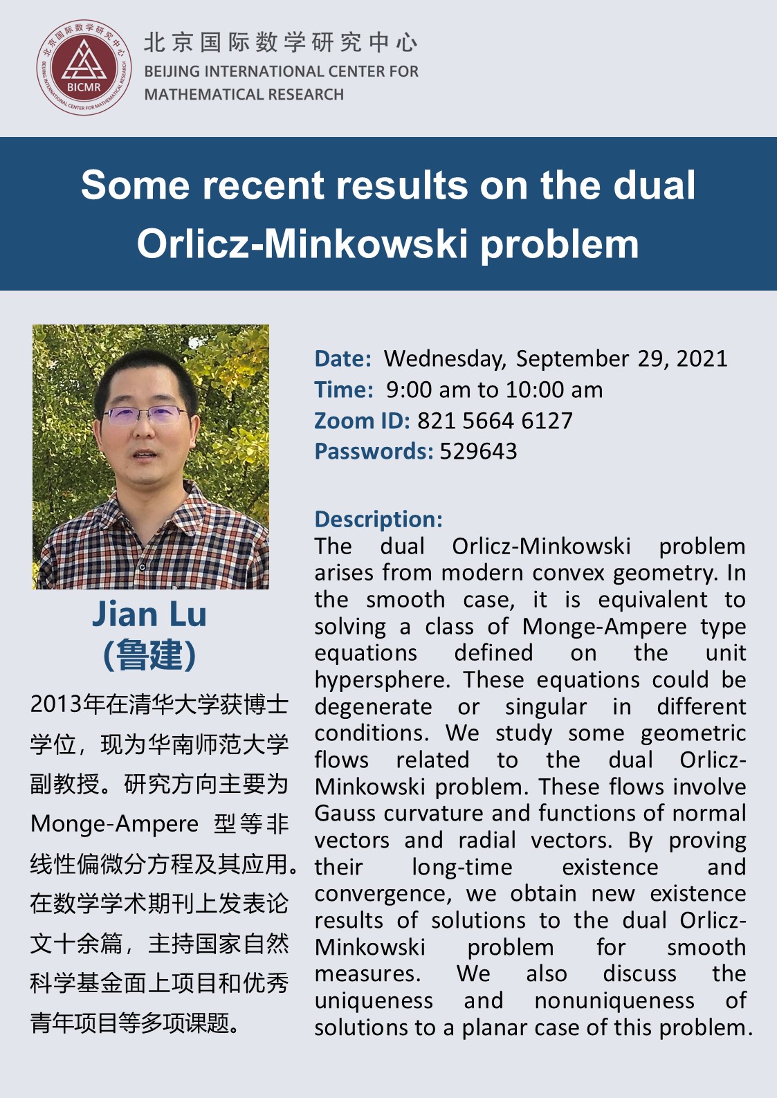 2013年在清华大学获博士学位,现为华南师范大学副教授。研究方向主要为 Monge-Ampere 型等非线性偏微分方程及其应用。在数学学术期刊上发表论文十余篇,主持国家自然科学基金面上项目和优秀青年项目等多项课题。