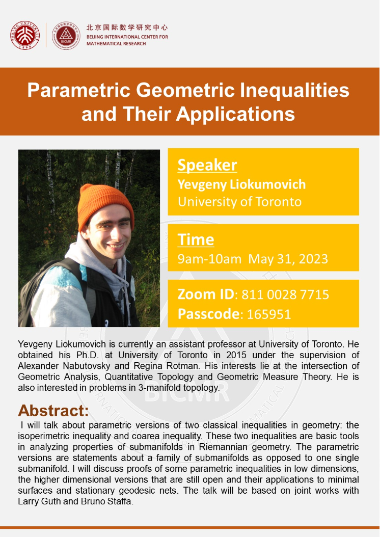 Speaker: Yevgeny Liokumovich is currently an assistant professor at University of Toronto. He obtained his Ph.D. at University of Toronto in 2015 under the supervision of Alexander Nabutovsky and Regina Rotman. His interests lie at the intersection of Geometric Analysis, Quantitative Topology and Geometric Measure Theory. He is also interested in problems in 3-manifold topology.