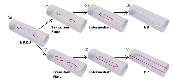 Confined nematic liquid crystals can admit multiple stable equilibria. These equilibrium states usually exhibit peculiar defect patterns in order to satisfy the topological constraints imposed by the boundary conditions. In this work, we systematically investigate transition pathways between different stable equilibria of nematic liquid crystals confined in a cylinder with homeotropic boundary condition. To do so, we implement spectral method to minimize the Landau-de Gennes free energy and develop a multiscale string method to accurately compute both minimal energy path and transition state. We first compute the transition pathways under the assumption that system state is invariant along the axial direction of the cylinder. This axial invariant assumption allows us to reduce the simulation domain to a two-dimensional disk. We subsequently remove the axial invariant assumption to search the transition pathways in the three-dimensional cylinder. Numerical simulations demonstrate that there exists a threshold for the cylinder height above which a dominolike transition pathway is more energetically favored than the axial invariant transition pathway. Moreover, we show that the transition pathway from escape radial with ring defects (ERRD) to escape radial has a lower energy barrier than the one from ERRD to planar polar, even though the free energy of the planar polar state is lower than that of the escape radial state. Our approach provides an accurate and efficient method to compute minimal energy path and transition state of confined nematic liquid crystals.