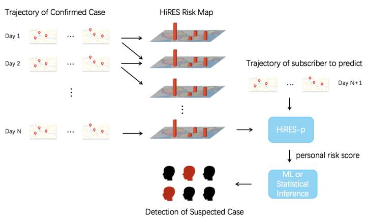 Emerging infectious diseases are existential threats to human health and global stability. The recent outbreaks of the novel coronavirus COVID-19 have rapidly formed a global pandemic, causing hundreds of thousands of infections and huge economic loss. The WHO declares that more precise measures to track, detect and isolate infected people are among the most effective means to quickly contain the outbreak. Based on trajectory provided by the big data and the mean field theory, we establish an aggregated risk mean field that contains information of all risk-spreading particles by proposing a spatio-temporal model named HiRES risk map. It has dynamic fine spatial resolution and high computation efficiency enabling fast update. We then propose an objective individual epidemic risk scoring model named HiRES-p based on HiRES risk maps, and use it to develop statistical inference and machine learning methods for detecting suspected epidemic-infected individuals. We conduct numerical experiments by applying the proposed methods to study the early outbreak of COVID-19 in China. Results show that the HiRES risk map has strong ability in capturing global trend and local variability of the epidemic risk, thus can be applied to monitor epidemic risk at country, province, city and community levels, as well as at specific high-risk locations such as hospital and station. HiRES-p score seems to be an effective measurement of personal epidemic risk. The accuracy of both detecting methods are above 90% when the population infection rate is under 20%, which indicates great application potential in epidemic risk prevention and control practice.