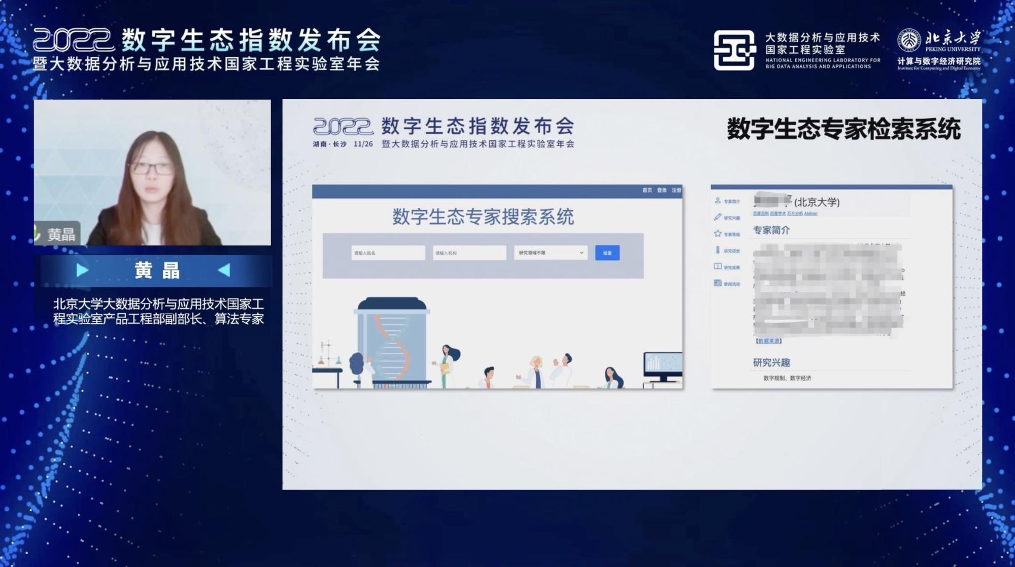 大数据分析与应用技术国家工程实验室产品工程部算法专家黄晶发布了数字生态专家检索系统,该系统旨在提升科研活动的组织效率并推动成果产出,搭建数字生态领域的沟通桥梁与科研转化平台。
