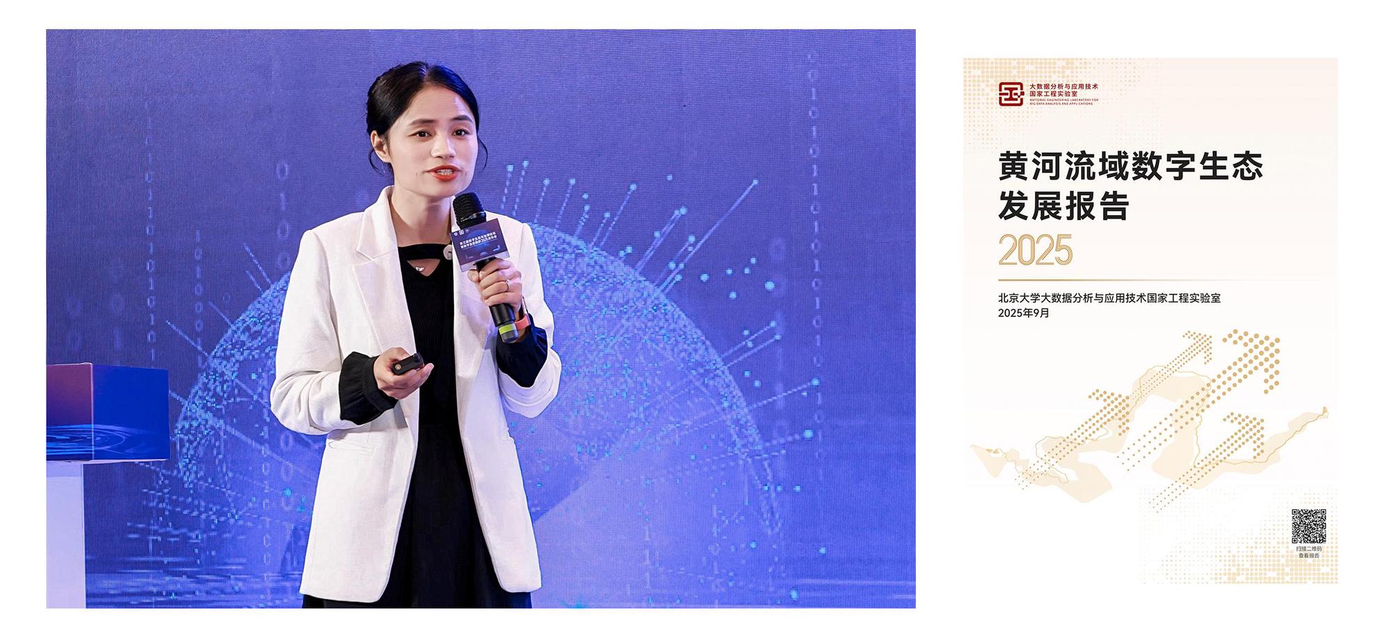 发布会上,实验室特聘副研究员王娟发布了《黄河流域数字生态发展报告2025》。王娟博士指出,繁荣数字生态已成为黄河流域高质量发展的新引擎。本年度的数字生态指数研究显示,沿黄九省区呈现出七大城市群多元并进、十大城市多极引领的梯度发展格局。报告还深入剖析了当前黄河流域数字生态发展面临的问题与挑战,并提出了针对性的策略与建议,希望能通过深度的生态融合与系统赋能,进一步增强区域间联动合作,全面推动高质量与跨越式发展的实现。