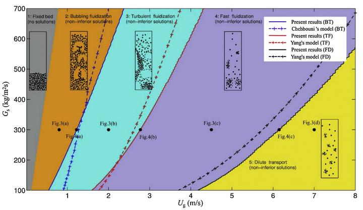 Gas–solid two-phase flow is ubiquitous in nature and many engineering fields, such as chemical engineering, energy, and mining. The closure of its hydrodynamic model is difficult owing to the complex multiscale structure of such flow. To address this problem, the energy-minimization multi-scale (EMMS) model introduces a stability condition that presents a compromise ofthe different dominant mechanisms involved in the systems, each expressed as an extremum tendency. However, in the physical system, each dominant mechanism should be expressed to a certain extent, and this has been formulated as a multiobjective optimization problem according to the EMMS principle generalized from the EMMS model. The mathematical properties and physical meanings of this multiobjective optimization problem have not yet been explored. This paper presents a numerical solution of this multiobjective optimization problem and discusses the correspondence between the solution characteristics and flow regimes in gas–solid fluidization. This suggests that, while the most probable flow structures may correspond to the stable states predicted by the EMMS model,the noninferior solutions are in qualitative agreement with the observable flow structures under corresponding conditions. This demonstrates that both the dominant mechanisms and stability conditionproposed for the EMMSmodel are physically reasonable and consistent, suggesting a general approach of describing complex systems with multiple dominant mechanisms.