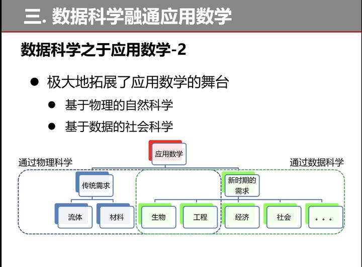 首先从数学发展的不同阶段、数学的研究方向、价值观以及驱动力等方面来介绍应用数学的历史与现状,接下来对数据科学的内涵进行简述,然后对数据科学在应用数学的学科建设、应用场景、成果落地及人才培养等方面所起的作用来阐述数据科学如何融通应用数学,最后对应用数学相关学生、学者、学会及创新科研机构的未来发展进行了展望。