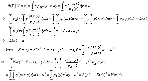 7. 假设X与Y是连续型随机变量.记Var[Y|X=x]为给定X=x的条件下Y的方差. 如果E[Y|X=x]=μ与X无关, 证明EY=μ而且VarY=