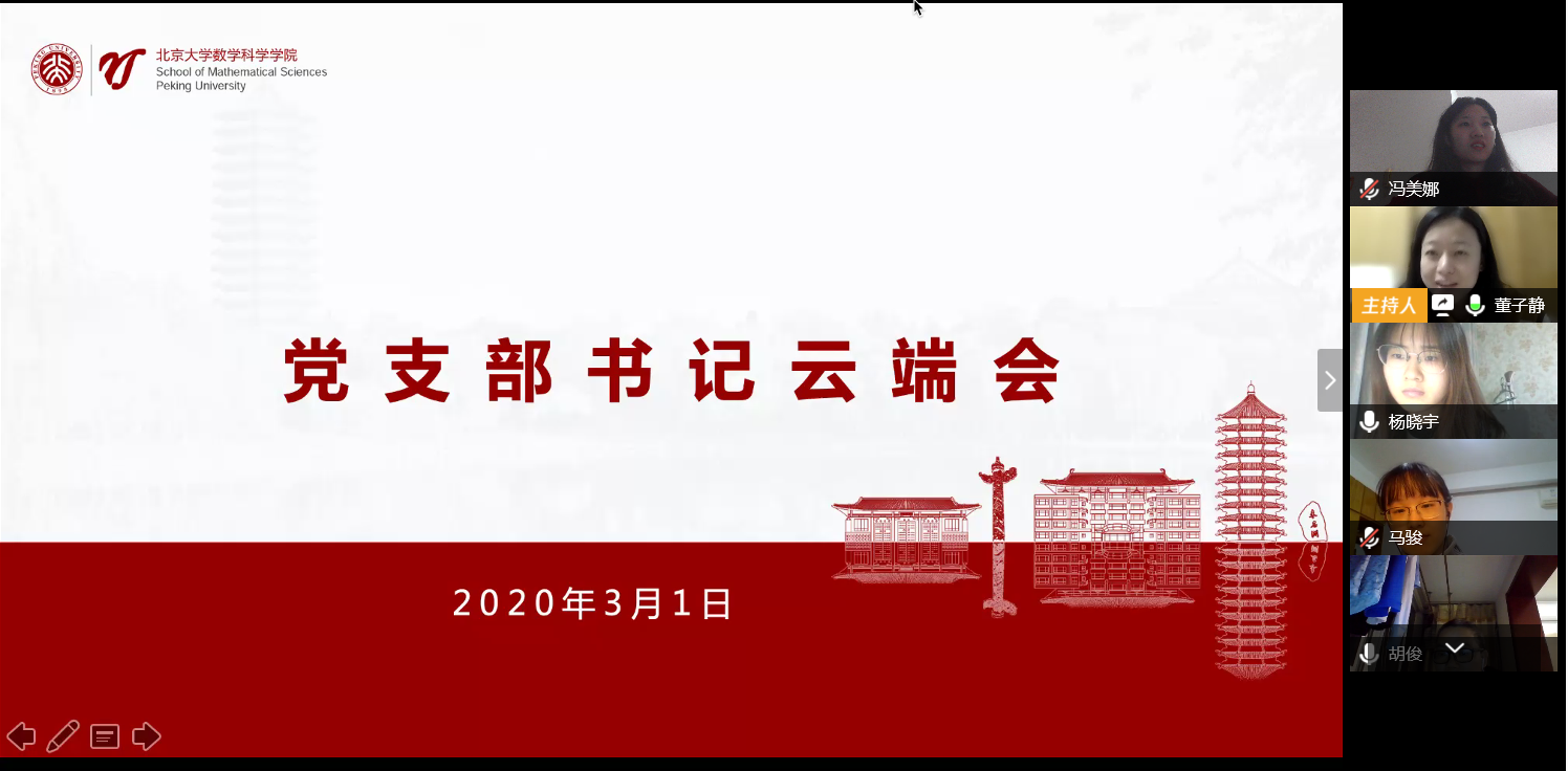 3月1日晚20:00,数学科学学院召开学生党支部书记线上视频会议,学习习近平总书记给在北京大学首钢医院实习的西藏大学医学院学生的回信精神,并就当前时期的学生党建工作进行部署。院党委书记胡俊、党委秘书梁岚与13位学生党支部书记参会,会议由院党委副书记董子静主持。