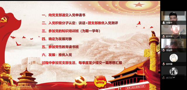 团支书张晨晔统计参会团员人数到达全体团员人数的三分之二,宣布会议有效并介绍7位申请入党的同学名单。7位申请入党的积极分子依次进行自我阐述和个人测评,讲述自己的入党动机、自身的优缺点以及对党的认识,其他团员结合他们的阐述提出疑问和建议。7位积极分子阐述完毕后,与会团员进行线上投票,7位同学均获得三分之二以上多数通过。值得一提的是,代旸凡同学在满18周岁生日之际递交了入党申请书,本科生党支部也送上了为她准备的电子贺卡。