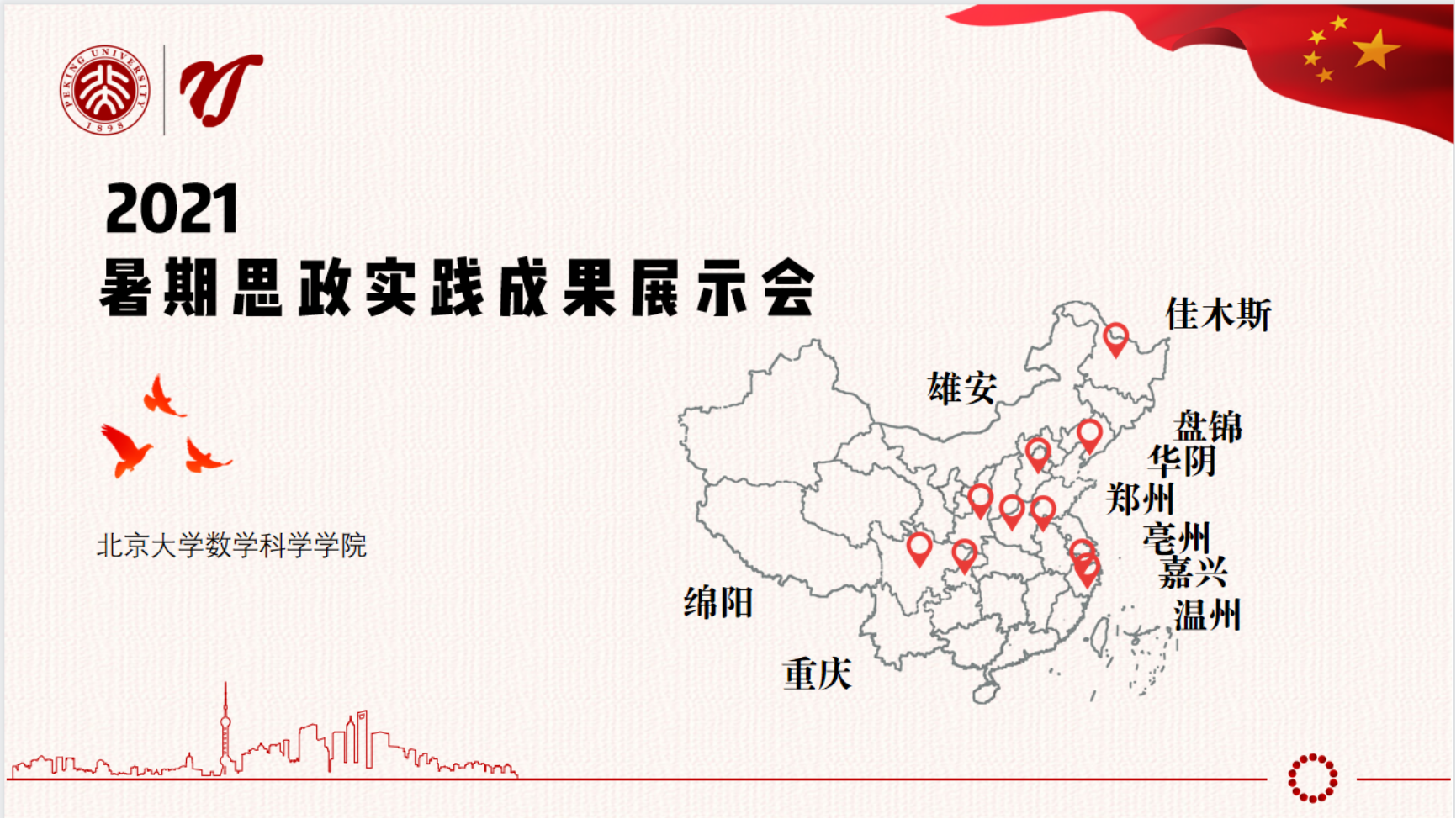 下午3时许,数学科学学院2021年暑期思政实践成果展示会在大家的掌声中落下帷幕。短短两个小时,十支实践团的同学们通过图文展示和讲述再现了暑期实践的精彩片段,让在场师生感受到了社会实践的魅力与意义。在本次暑期社会实践中,同学们在学院老师们的带领下克服疫情期间的不便,围绕不同调研课题,或是进行深入的实地考察,或是进行线上的调查研究,不仅体会到了最真实的基层情况,还对调研发现的问题进行了进一步的分析和思考,并且提出了自己的解决方案。在实践展示中,实践队员们关心祖国发展、融入新时代建设的热情和责任感打动了在场的老师和同学们。思政实践成果展示会不仅是对已完成实践活动的总结,也是为今后更高质量开展社会实践提供经验和范例。本次实践成果展示会的顺利开展,为今年暑期实践画上了圆满的句号。学史扬数风,百年践初心。北大数院人将再接再厉,用脚步丈量大地,走出更加精彩的实践之路!
