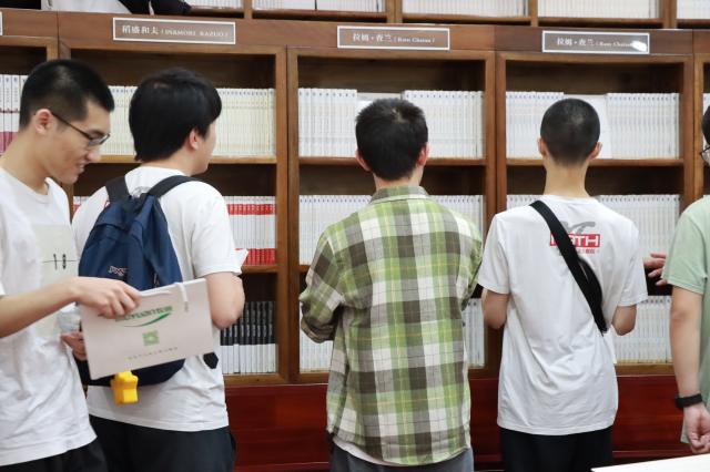 同学们在牧原文化书架前驻足
