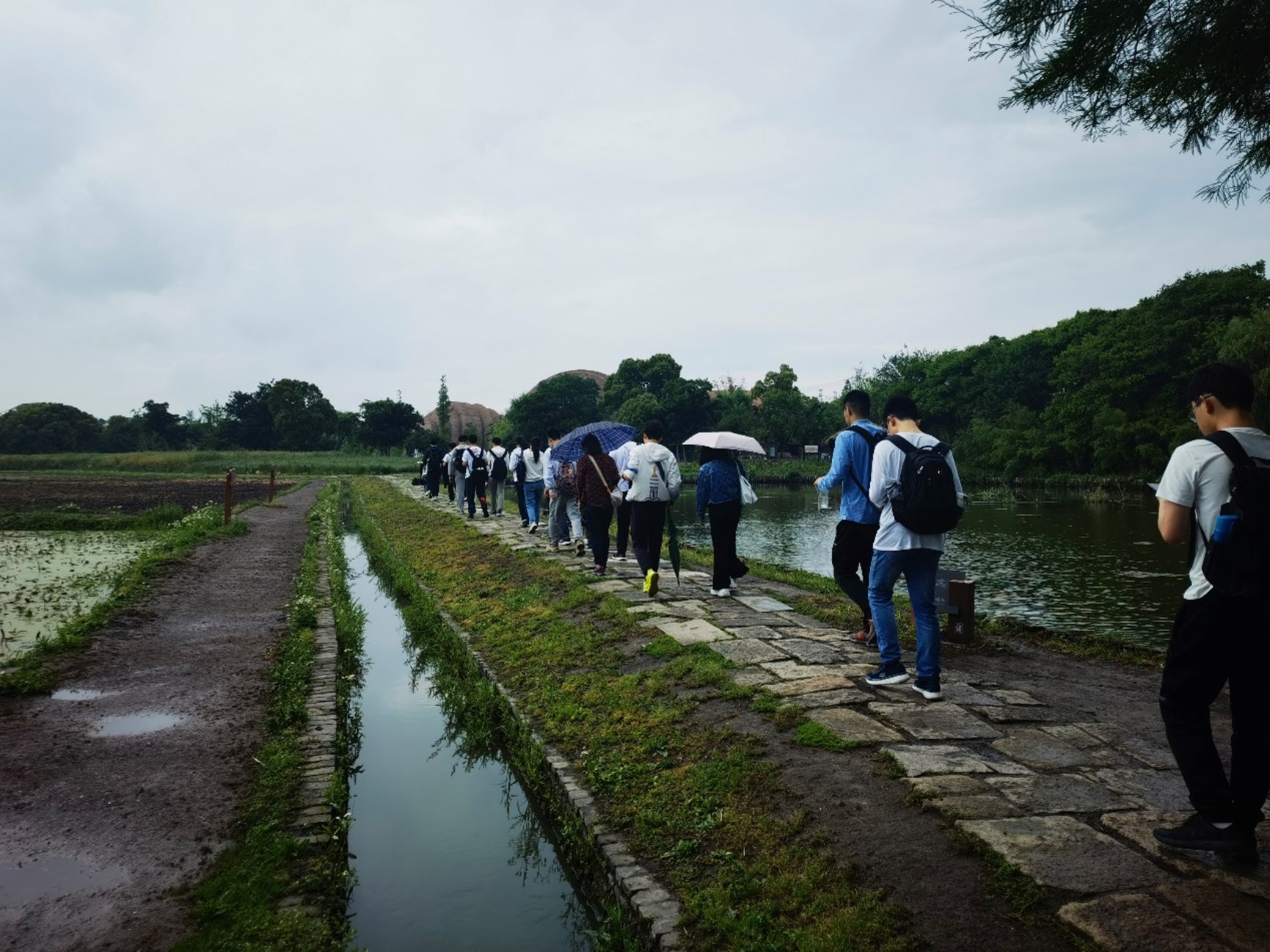 下午,实践团师生乘车来到松江,参观广富林遗址公园。这里展现了上海源自新石器时代晚期的悠久历史,也保留了明清时期江南书香门第的风韵。公园的水下展览馆通过复现的考古场景、挖掘出的实物和详细的解说词,生动地展示了松江地区从古至今超过3000年的文明发展历程,让同学们如同身临其境。同学们细心观摩着考古场景,充分了解了松江地区丰厚的文化底蕴,也深入理解了我国在重重困难下进行考古的特殊意义。在参观过程中,实践团师生还来到了陈子龙纪念馆前。陈子龙是末年大臣、学者,是在抗清斗争中牺牲的民族英雄。追忆其文学成就与民族气节,同学们感受到了“星动上台临虎帐,剑随中使出龙楼”的民族大义,深刻认识到知识分子应有与国家同命运、共生死的情怀,也加深了对于爱国精神的理解。