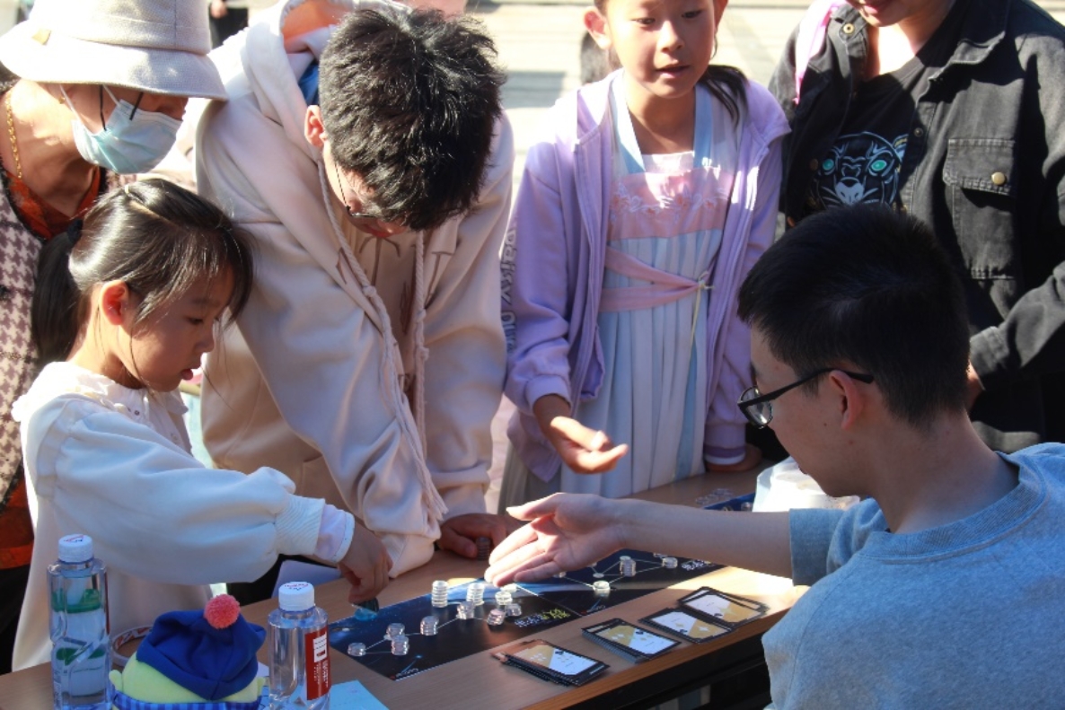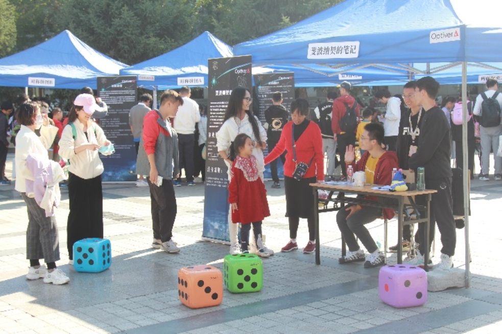 在百讲广场的正中央,“斐波那契的笔记”以显眼的骰子与刺激的规则吸引了众人关注。面对不确定性,参与者的选择各不相同:有人孤注一掷,迎来柳暗花明;也有人冷静保守,在赢取少量积分后就选择结束游戏。通过亲身体验,大家对于概率有了更深的了解。