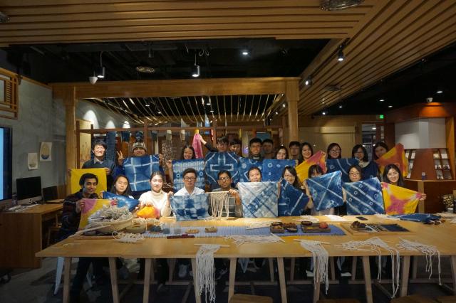在展馆老师的指导下,同学们亲自动手制作工艺品,体验了中国传统文化的魅力。一块小小的泡沫板,两个大头针和一把粗绳,就这些简简单单的工具,伴随着优美的音乐,大家开始了自己的第一次编平结的经历。随后,大家进入扎染区,通过一段视频了解了古代扎染的工艺和原材料的提取过程。随后展馆老师为每位同学分发了一方白色手帕,大家充分发挥自己的创意,利用平板和橡胶绳,为自己的手帕定型,染色,各具特色的扎染作品引起了大家一番热烈交流,同学们互相交换彼此的扎染作品,分享着自己的奇思妙想。