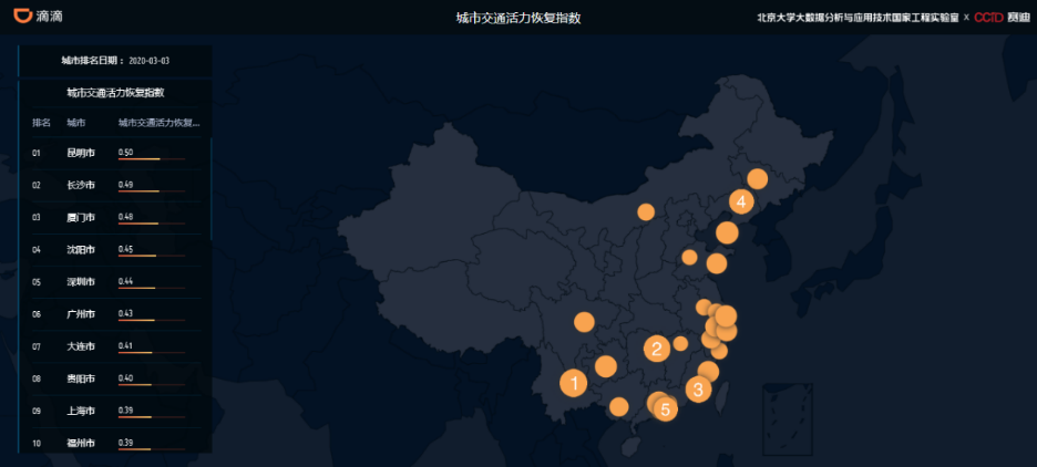 3月4日,实验室联合常务理事单位滴滴出行及中国电子信息产业发展研究院(赛迪研究院),共同发布城市交通活力恢复指数排行榜。此次发布的城市交通活力恢复指数,是结合城市交通轨迹、道路拥堵数据及滴滴平台通勤数据综合分析得出。指数越高,说明城市交通活动量更积极。数据显示,自2月10日起,全国交通出行活力稳步提升。