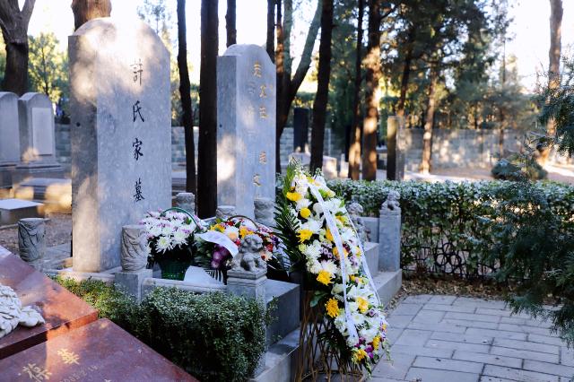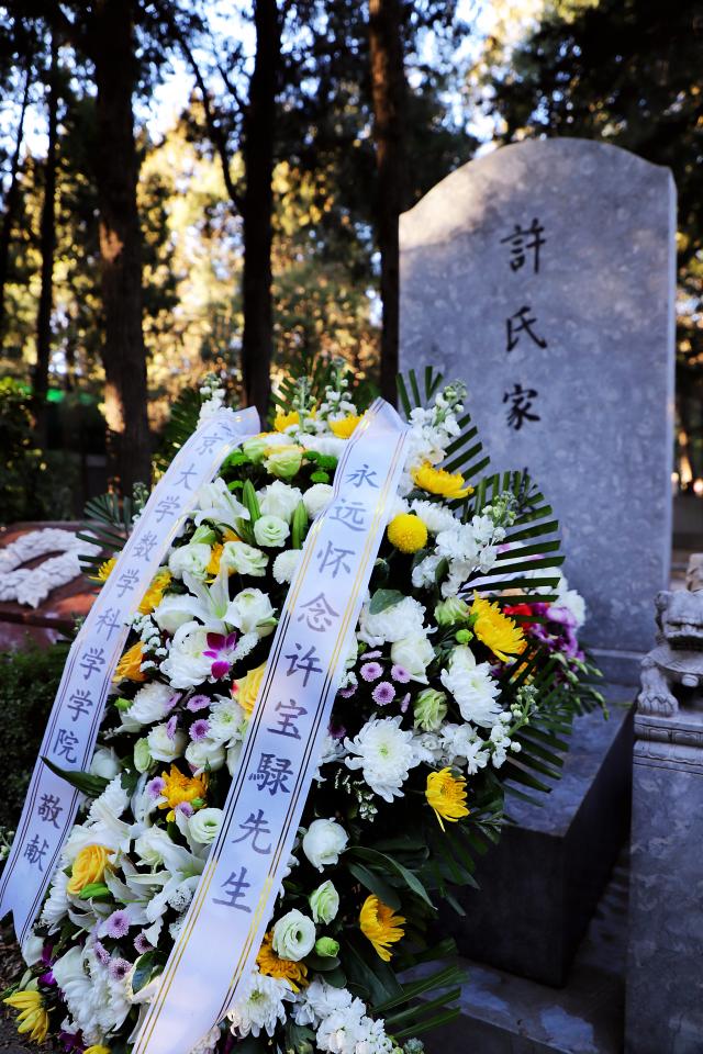 上午10时,万安公墓庄严肃穆,四周苍松翠柏,北京大学数学科学学院王诗宬院士,院长陈大岳,党委书记胡俊,概率统计系主任任艳霞等近30位教师肃立于许宝騄先生墓碑前,向先生默哀致敬,敬献花篮并整理挽联。墓碑前的花篮凝聚着北大数学师生对许宝騄先生的崇高敬意,先生的治学精神历久弥新,深深烙印于北大数学人心中。