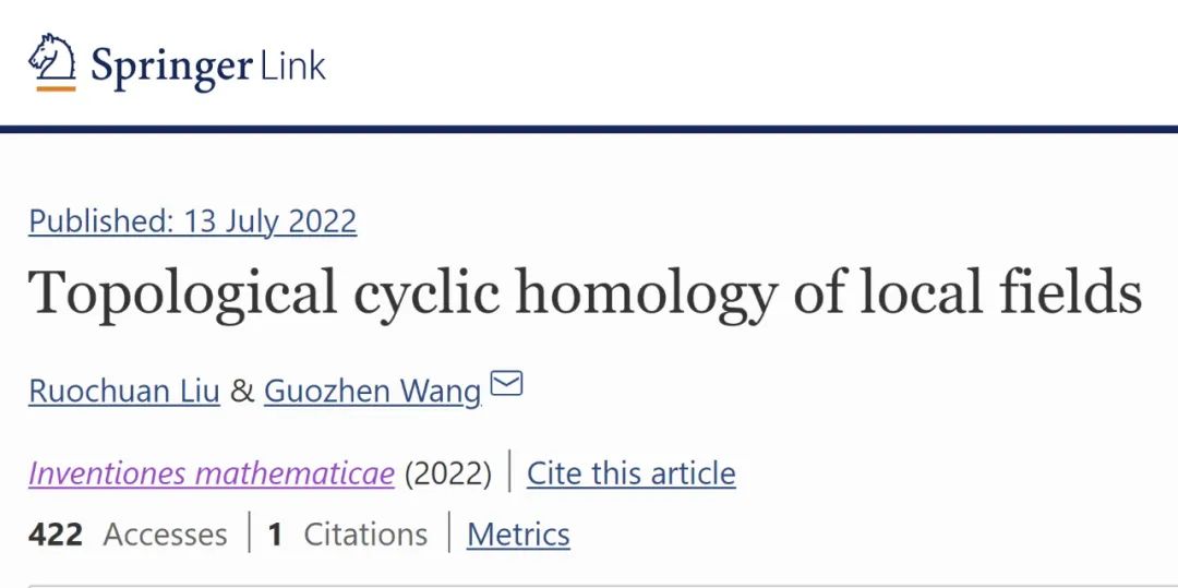 日前,国际顶尖数学期刊Inventiones Mathematicae在线发表了北京大学博雅特聘教授刘若川与上海数学中心教授王国祯合作的论文“Topological cyclic homology of local fields”。