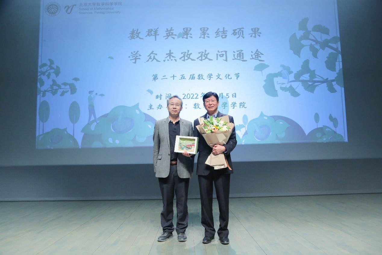 学生代表为张占海献上鲜花,陈大岳代表数学科学学院向张占海赠送北京大学文创纪念品。