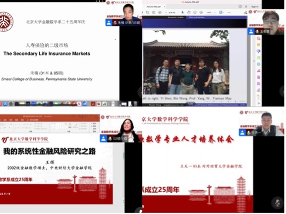 2022年11月19日,北京大学数学科学学院金融数学系成立25周年系庆活动于线上举行。北京大学数学科学学院院长陈大岳教授出席活动并致辞,数学科学学院师生、院友及关心金融数学系的各界人士400余人参加本次系庆活动。活动由数学科学学院金融数学系主任吴岚教授主持。